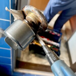 まずは内側ノブを外そうとハンマーで叩くも、まったく動かず。