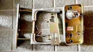 通常は分解しない内部まで慎重に解体していくと、レバーハンドル内部のバネが外れてしまい、元に戻せない状態に。応急処置として、ロック機能だけは確保し、後日再訪することに。