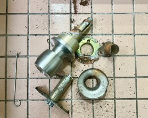 腐食したノブは通常の方法では取り外しが困難な状態でしたが、残った金属部分を慎重に曲げて引き出し、ペンチでゆすりながら取り外しに成功。