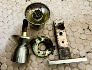 使用されていたのは、アルファ社製のインテグラル錠。ノブのがたつきが激しく、触れるだけで手に錆びが付着するほど腐食が進行していました。特に内側の固定部は錆びにより固着しており、通常の取り外しが困難な状態。マイナスドライバーとハンマーを用いて慎重に取り外し、内部を確認したところ、錆びが広範囲に及んでいたため、錠前全体の交換が必要と判断しました。