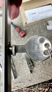 この調整により、錠前の貫通穴の位置も正確に合うようになり、鍵の動作もスムーズに。最後に、ドアの色に合わせてMIWA社のPSSL09-1LS(ST色)を取り付け、作業は約1時間で完了しました。