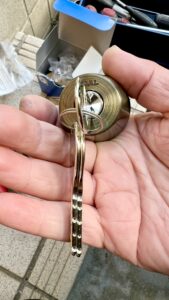 事前にお写真を送っていただき、現地の状況を確認したところ、取り付けられていたのはすでに廃盤となっている造作タイプの錠前。一般的な交換用シリンダーが流通しておらず、内筒のみの交換ができない構造でした。