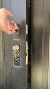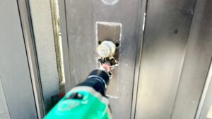 これで開くはずとドアを引いてみましたが、まだ開かず。お客様から上の鍵の方が以前からおかしかったとの情報をいただき、再度上部の錠前を操作。開いているように見えましたが、念のため上のケースもドリルで破壊し、デッドボルトを取り出すと、ようやくドアが開きました。