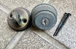 既存の錠前を丁寧に取り外し、新しいディンプルキーシリンダーを正確に取り付けました。