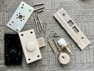 初回の反省を踏まえ、再訪時には、考えられるすべてのパターンに対応できるよう、複数種類のシリンダー・錠前部材を準備して現場へ向かいました。
